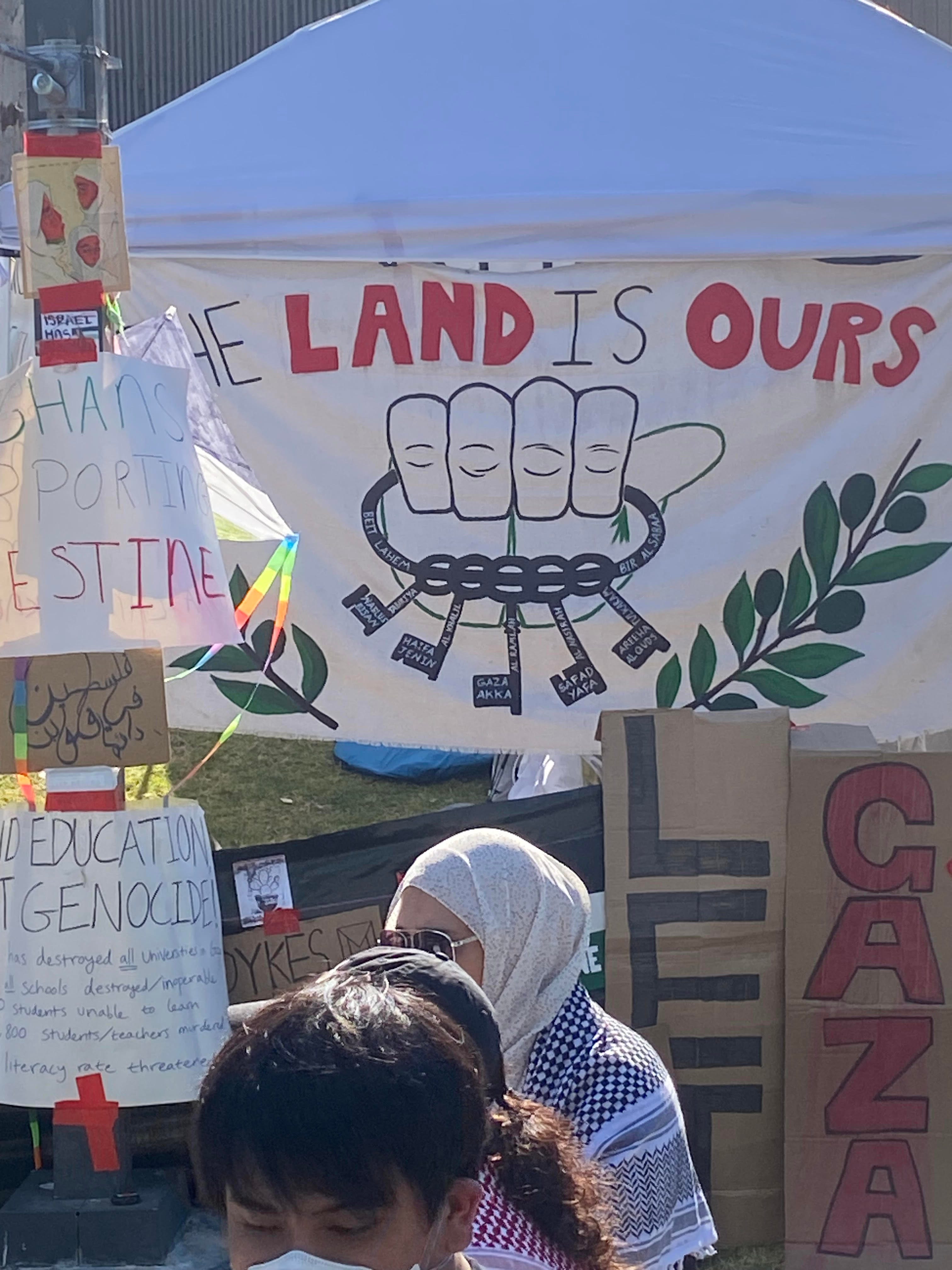Just past him, I saw the counterdemonstration. We clearly outnumbered them, but more and more students were arriving with Palestinian-style keffiyehs covering their faces. They held signs calling for the end of the “Zionist entity,” “Death to settler colonialism,” and “Zionism equals Nazism.” They started their own chants. First, inevitably, “From the river to the sea, Palestine will be free!” Then “Death, death, death. Death to the IDF.” Soon, they were as loud as us, and the sounds melded together into a demonic chaos.